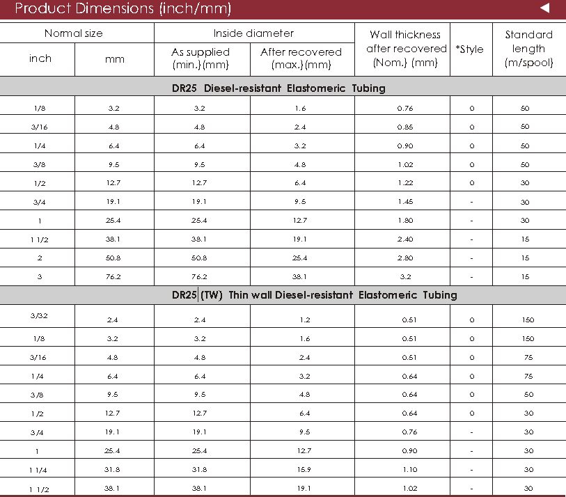 DR-25 is flexible and abrasion resistant, it is made from modified radiation crosslinked elastomeric material, has superior diesel, chemical and abrasion resistant properties, specially formulated for optimum high temperature fluid resistance, and long term heat resistance. It can provide effective protection to cable termination, splices and joint used in military vehicles etc. DR-25TW is thin wall flexible diesel resistant elastomeric heat shrinkable tubing • Operating temperature range -75oC to +150oC